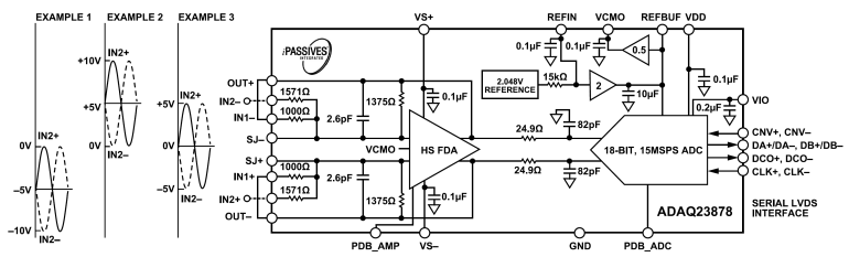Wewnętrzna integracja rozwiązuje wiele wyzwań projektowych, podczas gdy urządzenie nadal zapewnia elastyczność konfigurowalnej pętli sprzężenia zwrotnego sterownika ADC, aby umożliwić regulację wzmocnienia lub tłumienia. Pojedyncze zasilanie 5 V DC jest możliwe przy zachowaniu optymalnej wydajności układu.