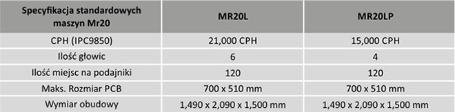 Jest tu mowa o maszynach wyposażonych w ruchome ramiona, które w zależności od wersji posiadają cztery (MR20LP), albo sześć (MR20L) głowic montażowych. Zarówno typowy chipshooter (MR20L), jak i automat do elementów mieszanych (MR20LP) dają możliwość montażu elementów elektronicznych o wielkościach: od 01005 do 5x5 cm, z czego ostatni z wymienionych zapewnia sposobność obsługi elementów o wysokości do 2,5 cm. Maszyny z prezentowanej serii pozwalają na indywidualne konfigurowanie wyposażenia, co przekłada się na bardzo dokładnie dopasowanie do potrzeb produkcji.