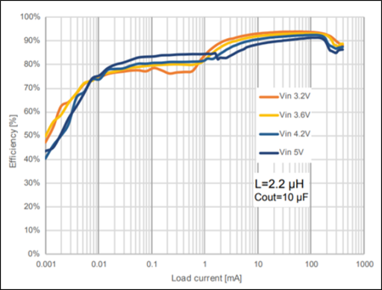 Bardzo wysoka sprawność przetwornicy w bardzo szerokim zakresie obciążenia to cecha rzadko spotykana ale pożądana w aplikacjach zasilanych bateryjnie. W przedziale od 100 nA do 100 mA sprawność wynosi ponad 90%.