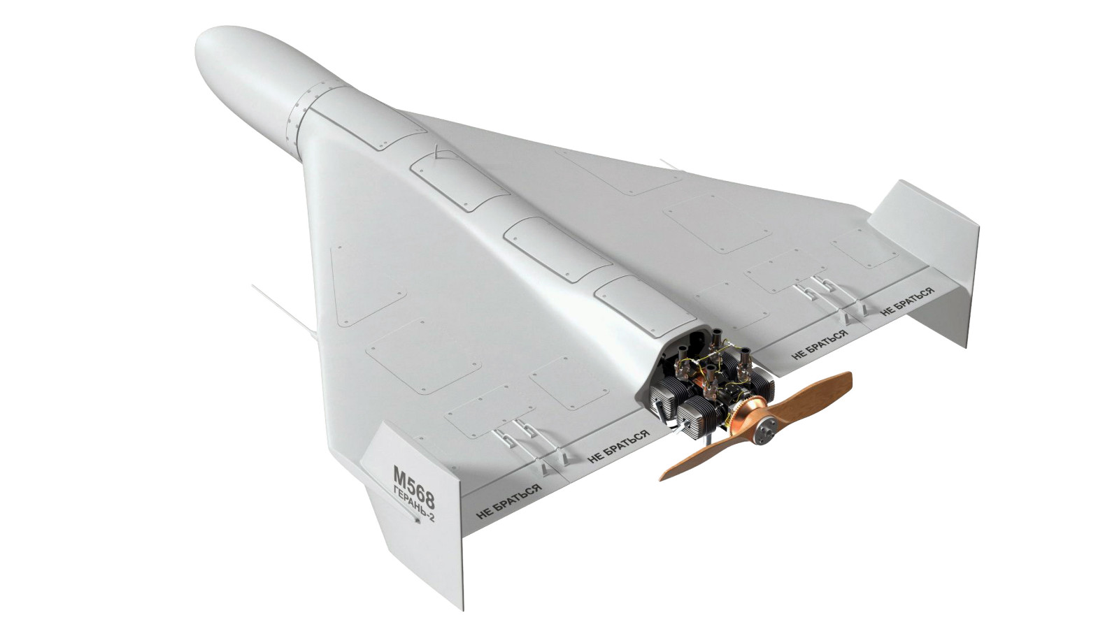 Najpopularniejszą serią rosyjskich dronów kamikaze jest Geran-2 (fotografia 2). Maszyny te przypominają formą klasyczne samoloty z układem skrzydeł typu delta, mają masę startową około 200...240 kg i zasięg 1000...2500 km. Kadłub wykonano z kompozytu włókna szklanego i węglowego z wypełnieniem poliuretanowym, a najnowsze modele dodatkowo są malowane farbą absorbującą sygnały radarowe. Te bezzałogowce mają długość ok. 3,5 m i rozpiętość skrzydeł 2,5 m. Silniki MD550 to wspomniane wyżej kopie L550E. Prędkość przelotowa dochodzi do 150...185 km/h. Mimo że system nawigacji Kometa-M jest rzekomo odporny na zagłuszanie, drony są wyposażane w układy nawigacji inercyjnej oparte na układach firm Murata i Analog Devices. Najnowsze modele korzystają z modułów Nvidia Jetson Orin Nano w połączeniu z kamerą w nosie statku, przeznaczoną do wykrywania i klasyfikowania potencjalnych celów – Geran-2 może dokonać wyboru przy braku łączności z operatorem, po czym samodzielnie w ten cel trafić. Spotykane są trzy rodzaje głowic: standardowe o masie 50 kg, wzmocnione o masie 90 kg (z mniejszym zbiornikiem paliwa, co obniża też zasięg) oraz głowice termobaryczne. Te ostatnie działają przez wytworzenie chmury wybuchowego aerozolu, który jest niemal natychmiastowo detonowany. Siła takiego wybuchu jest znacznie większa, ale rozproszona na większej przestrzeni. Wariant E ma pocisk rakietowy powietrze-powietrze, rosyjski operator może go odpalić, gdy zobaczy na obrazie z kamery ukraiński śmigłowiec lub myśliwiec przechwytujący.