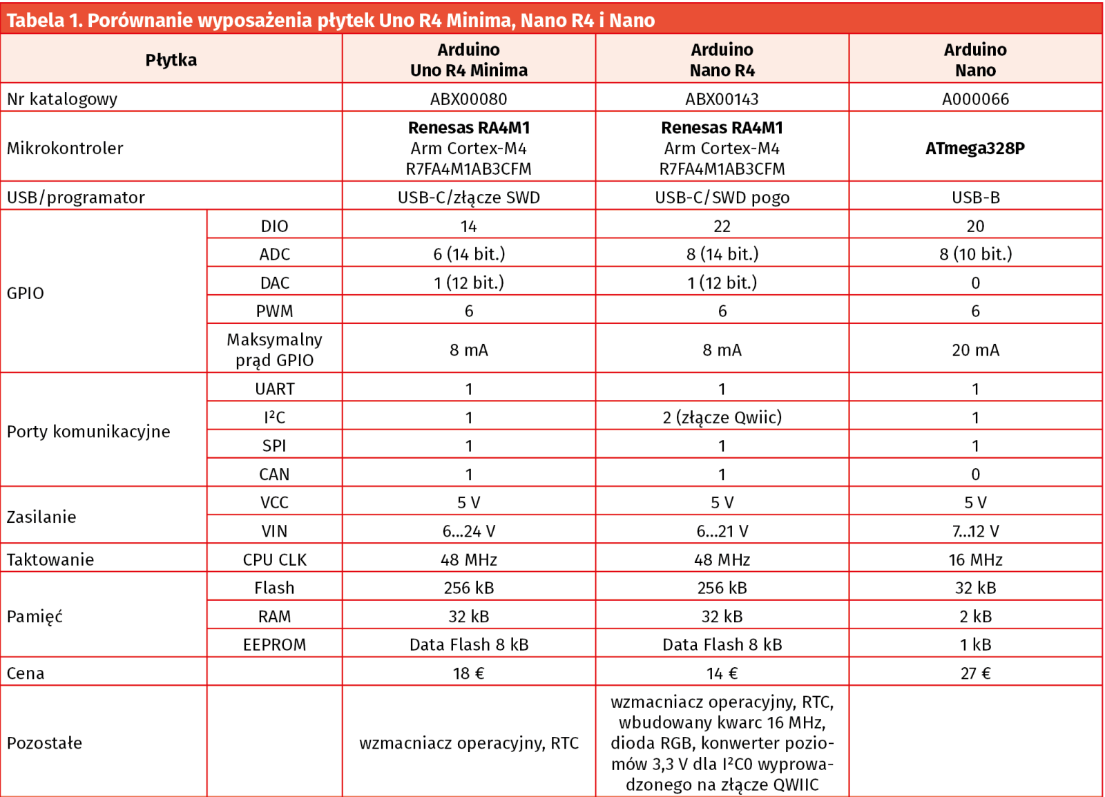 Podobnie jak w przypadku większych modeli Arduino R4 Minima i Arduino Uno R3, płytka Nano R4 ma być alternatywą dla leciwego już Arduino Nano. Dobrą wiadomością jest fakt, że zachowano dokładnie ten sam kontroler R7FA4M1AB3CFM, co w większej wersji. Wróży to zachowanie zgodności z wcześniejszymi projektami, które można będzie przenieść na mniejszą (pod względem rozmiarów) platformę. Dla porównania w tabeli 1 zestawiono podstawowe parametry Uno R4 Minima, Nano R4 i Nano.