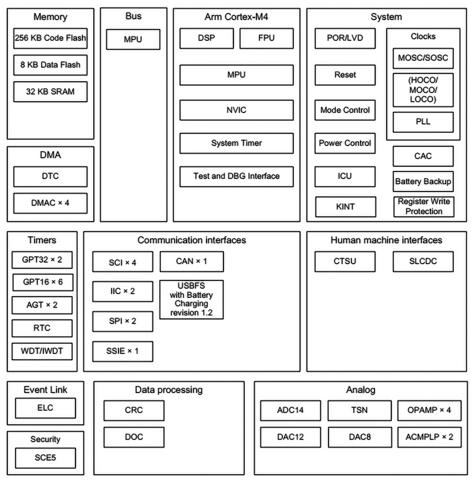 Nano R4 bazuje na układzie R7FA4M1AB3CFM w obudowie LQFP-64, którego budowę wewnętrzną pokazano na rysunku 1. Konkurencyjne płytki XIAO RA4M1 są budowane w oparciu o R7FA4M1AB3CNE w obudowie QFN-48, o zmniejszonej liczbie wyprowadzeń GPIO, co wymaga dodatkowej konfiguracji Arduino i pewnych zmian w oprogramowaniu - ale w zamian otrzymujemy tanią (koszt to około 6 €) i naprawdę niedużą płytkę. Nano R4 jest dostępne w wersjach z wlutowanymi złączami goldpin oraz bez nich (są natomiast dołączone do płytki w opakowaniu), a różnica w cenie to trochę ponad 1 €. Tak jak wcześniej opracowane wersje z ESP32 czy RP2040, płytka - oprócz wlutowania złączy - umożliwia bezpośredni montaż SMT na płycie bazowej urządzenia, gdyż wyposażona jest w metalizowane złocone pady na krawędziach (tzw. castellated holes - przyp. red.).