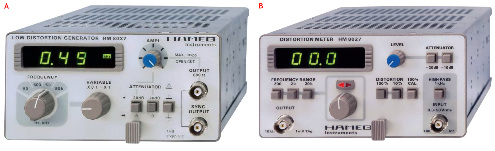 Sprzęt ten - w podstawowej wersji - dostępny jest w cenie przekraczającej 40 000 dolarów (!). Jest to w zasadzie jedno z nielicznych dostępnych rozwiązań do specjalistycznych pomiarów audio. Z kronikarskiego obowiązku i czystej sympatii dla systemu Hameg HM8000 warto przypomnieć moduły generatora o niskich zniekształceniach HM8037 i współpracującego z nim miernika zniekształceń nieliniowych HM8027, pokazane na fotografiach 2a i 2b, których używam od końca lat 90. ubiegłego wieku do dziś…
