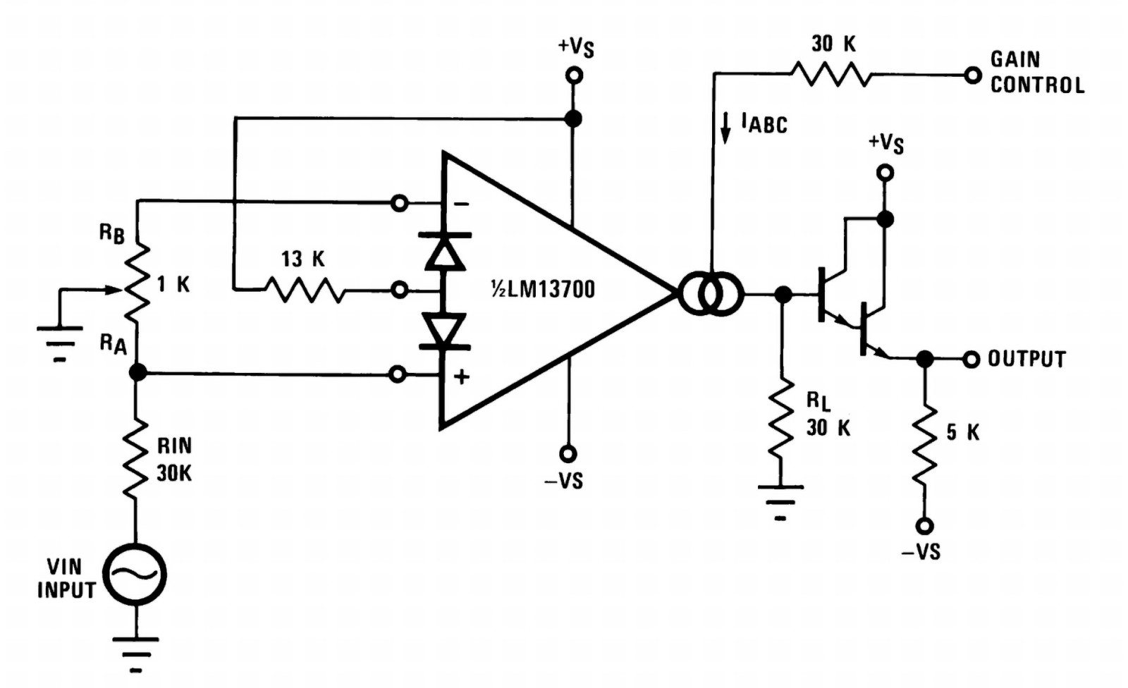 Na rysunku 1 przedstawiono schemat VCA z noty katalogowej LM13700 (rysunek 20 w nocie katalogowej). LM13700 to wzmacniacz transkonduktancyjny, czyli zamieniający sygnał napięciowy na prądowy. Sygnał ten jest konwertowany ponownie na napięcie i buforowany przez dwutranzystorowy układ Darlingtona, który stanowi integralną część struktury układu scalonego. Wzór na wzmocnienie układu wygląda następująco: