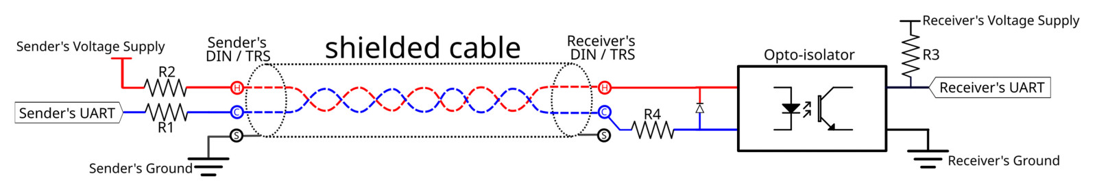 Standard MIDI opiera się na przesyłaniu relatywnie krótkich komunikatów za pomocą transmisji szeregowej. Warstwa fizyczna protokołu bazuje na pętli prądowej z izolacją optyczną po stronie odbiorcy. Taka forma łączności pozwala na zachowanie wysokiej odporności na zakłócenia i pełnej, galwanicznej izolacji, jako że tylko strona nadawcza ma przyłączony ekran. Do połączeń wykorzystuje się 5-pinowe gniazda DIN, z czego tylko trzy są użyte po stronie nadawczej, a dwa po stronie odbiorczej. Niekiedy spotykało się też wariant oparty na złączach TRS (jack 6,3 mm), a w mniejszych urządzeniach – miniDIN. Fizyczną implementację przedstawia rysunek 1.