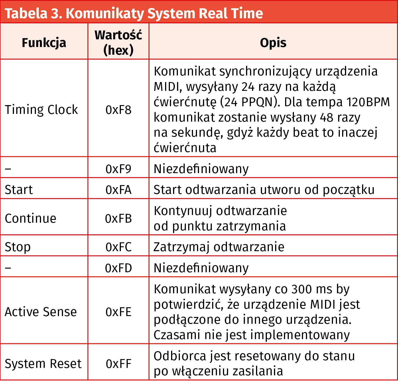 Komunikaty System (0xF) realizują szereg funkcji kontrolnych. Jeśli pierwszy bit w drugiej połówce bajtu Status jest ustawiony na 1, komunikat jest typu System Real Time, co oznacza, że jest to komunikat priorytetowy. Tabela 3 zestawia znaczenie poszczególnych komunikatów.