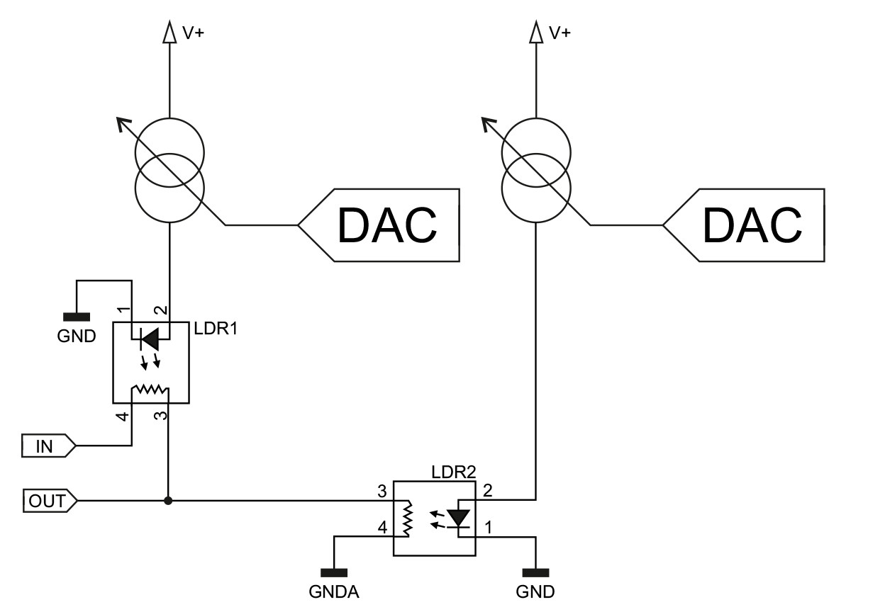 Układ ten jest opcją „na bogato”, w której mamy zmienną zarówno rezystancję „górną” naszego „potencjometru” (optoizolator LDR1), jak i „dolną” przy wykorzystaniu optoizolatora LDR2. Budując taki układ trzeba jednak konieczne przewidzieć możliwość jego automatycznej kalibracji, gdyż fotorezystory mają znaczne rozrzuty parametrów. Dodatkową zaletą jest całkowita izolacja galwaniczna między sygnałem analogowym a sterującym. W prototypie, który badałem kilka lat temu, nie było fotorezystora LDR1 (został zastąpiony stałym rezystorem), a dynamika regulacji i tak sięgała 65 dB. Warto jednak ten układ utrzymywać w stałej temperaturze, gdyż przy wysokich wartościach rezystancji wpływ temperatury na parametry fotorezystora jest znaczący. Dodatkowo, z uwagi na szumy, lepiej byłoby go chłodzić niż grzać. Jest to propozycja bardziej dla audiofili, niż dla zwykłego zjadacza chleba, choć z pozornie dziwnych pomysłów czasem wykluwają się kolejne.