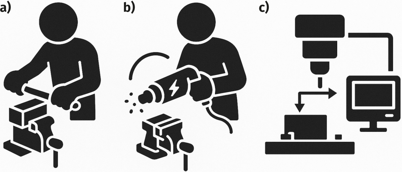Zaletą stosowania maszyn CNC jest obróbka z dużą szybkością, dokładnością i powtarzalnością oraz ograniczenie błędów ludzkich i strat materiałowych. Schematyczną ilustrację obróbki szlifowania realizowanego ręcznie, przy pomocy elektronarzędzia i maszyny CNC zaprezentowano na rysunku 1.