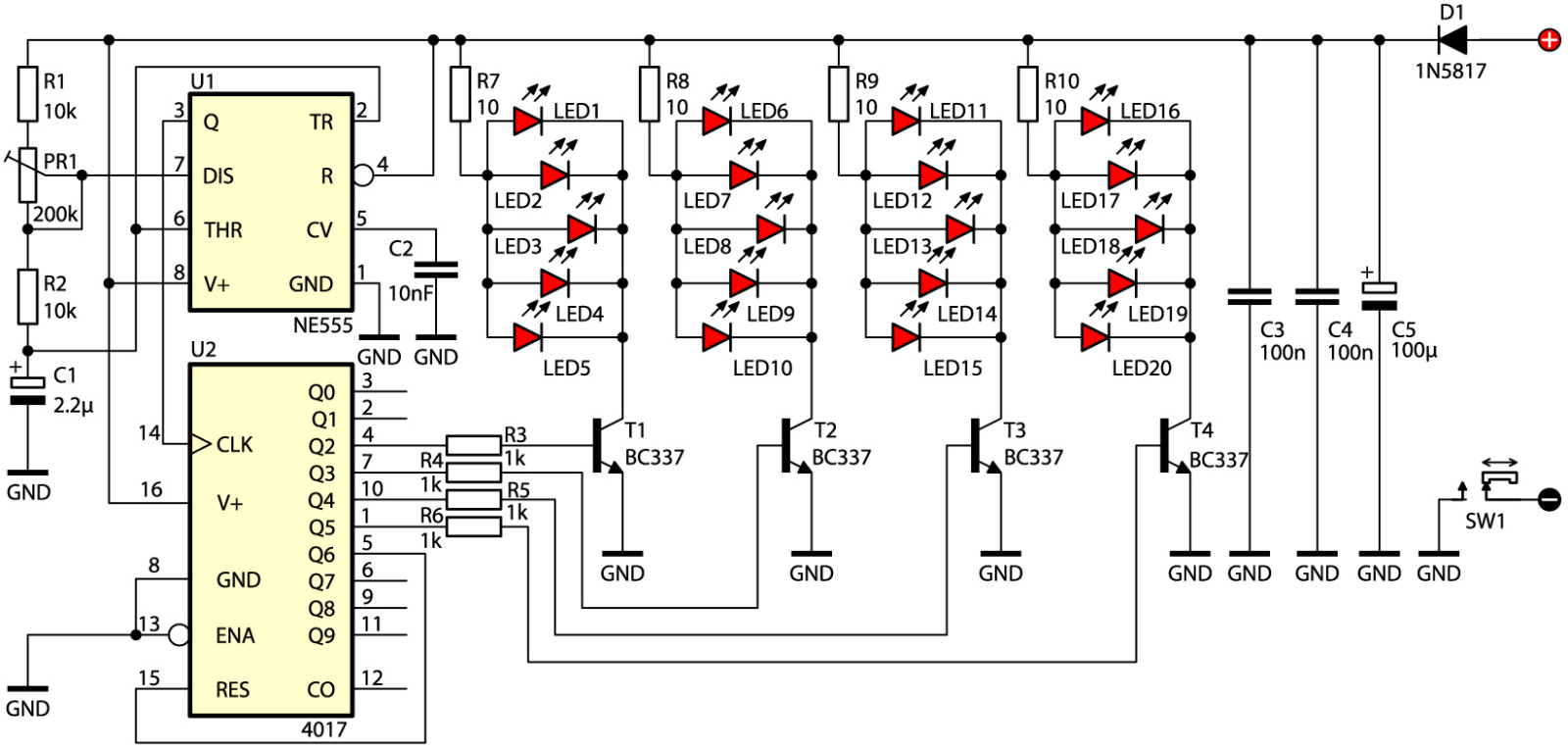 Tranzystory BC337 pełnią funkcję wzmacniaczy prądowych, umożliwiając jednoczesne zasilanie kilku diod LED z każdego aktywnego wyjścia licznika. Zasilanie zestawu odbywa się z koszyka na trzy baterie R6/AA (łącznie ≈ 4,5 V). Dioda D1 chroni układ przed odwrotną polaryzacją, kondensatory C3, C4 i C5 filtrują napięcie zasilania, rezystory R7…R10 ograniczają prąd płynący przez diody LED (chroniąc je przed uszkodzeniem), natomiast rezystory R3…R6 ograniczają prąd wpływający do baz tranzystorów T1…T4. Elementy R1, PR1, R2 i C1 ustalają tryb pracy oraz częstotliwość sygnału generowanego przez U1, a układ U2 zlicza te impulsy i w zależności od ich liczby kolejno aktywuje wyjścia Q0…Q9.