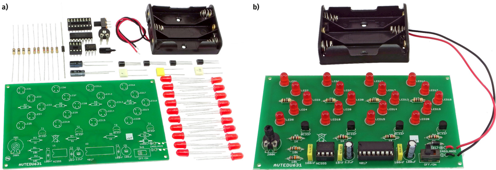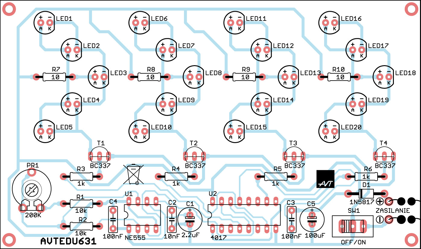 Na koniec warto dodać, że zestaw AVTEDU631 to doskonała okazja, by w praktyce poznać zasadę działania generatora impulsów zbudowanego na układzie NE555 oraz licznika dziesiętnego typu Johnson (CD4017) – klasycznego rozwiązania stosowanego w wielu efektach świetlnych i urządzeniach edukacyjnych.