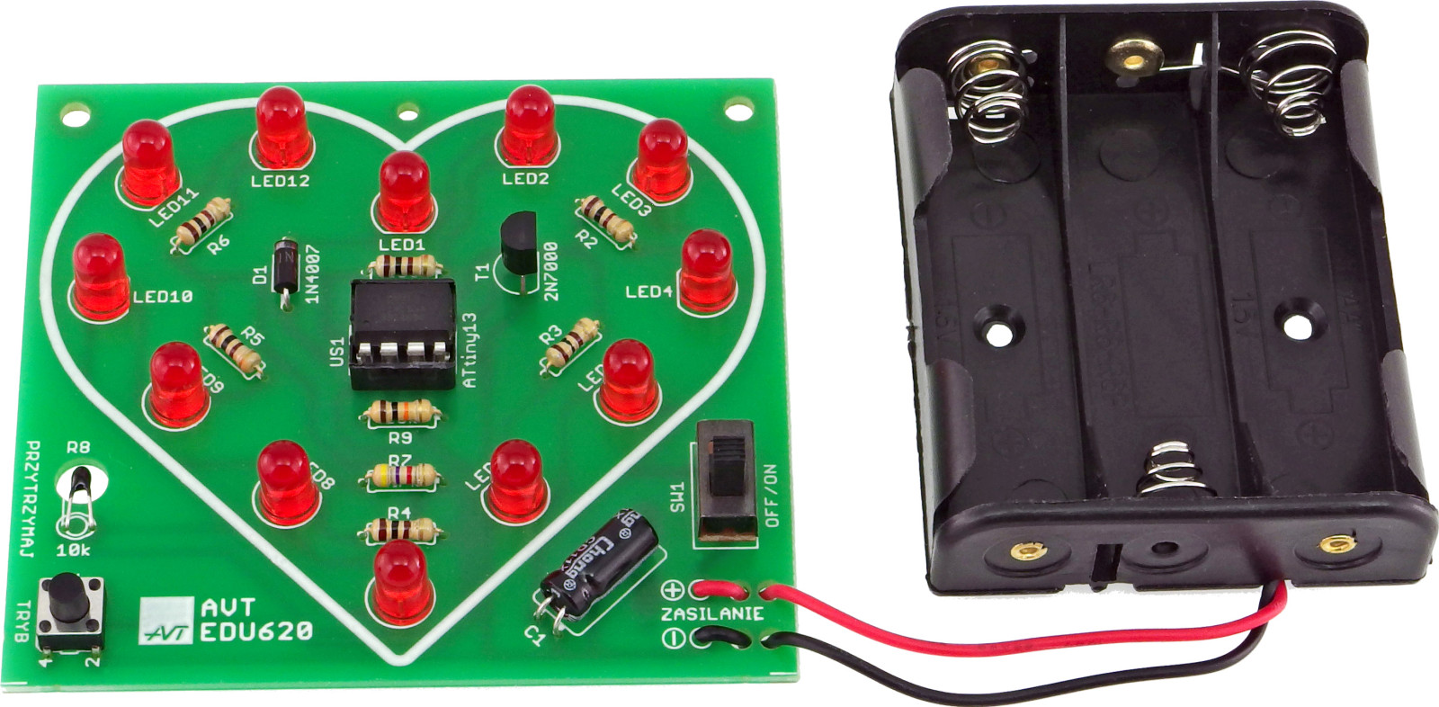 Podczas tego spotkania zbudujemy zestaw AVTEDU620 – Bijące serce LED – niewielki układ, który potrafi ożywać światłem. Diody LED nie migają tu przypadkowo, lecz rozjaśniają się i gasną w określonym rytmie, tworząc wrażenie pulsowania przypominającego bicie serca. Charakterystyczną cechą tego projektu jest to, że tempo ustawionego efektu (do wyboru są trzy) nie jest stałe. Układ reaguje na temperaturę czujnika – gdy dotkniemy go palcem lub zbliżymy do źródła ciepła, rytm światła zmienia się i staje się szybszy. Dzięki temu serce LED sprawia wrażenie, jakby reagowało na otoczenie. Taki sposób działania sprawia, że gotowy układ jest nie tylko efektowny, ale też ciekawy w obserwacji. Można sprawdzić, jak zmienia się jego „puls”, porównać różne sytuacje i przekonać się, jak subtelnie zastosowanie prostego czujnika pozwala elektronice reagować na nasz dotyk.