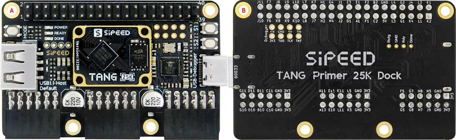 Zestaw składa się z płytki głównego modułu, zawierającej układ FPGA typu GW5A-LV25MG121, pamięć konfiguracji Flash 64 Mb oraz przetwornicę napięcia, a także płytki bazowej wyposażonej w debugger, złącza USB (jedno do podłączenia zewnętrznych urządzeń, drugie do programowania i zasilania), trzy złącza PMOD dla dodatkowych modułów oraz jedno złącze 2×20 pinów. Na płytce głównego modułu znajdują się dwa złącza męskie typu DF40C-60DP-0.4V(51) udostępniające 75 pinów IO, linie JTAG i MIPI oraz zasilanie (zarówno napięcie wejściowe, jak i wyjściowe przetwornicy). Sipeed dostarcza w dokumentacji informacje o dokładnych wymiarach płytki (22,9 mm × 17,8 mm) i rozstawie złączy (14 mm), dzięki czemu ten moduł można bezproblemowo zintegrować z własnymi projektami. Płytka bazowa ma złącza żeńskie typu DF40C-60DS-0.4V(51), a Sipeed dodaje w dokumentacji, iż są one dostępne w różnych wysokościach. Płytka modułu może być zasilana napięciem 3,6...5,5 V. Producent nie podaje w opisie dokładnej wartości poboru prądu, gdyż ten mocno zależy od stopnia wykorzystania układu FPGA Gowin GW5A-LV25MG121.