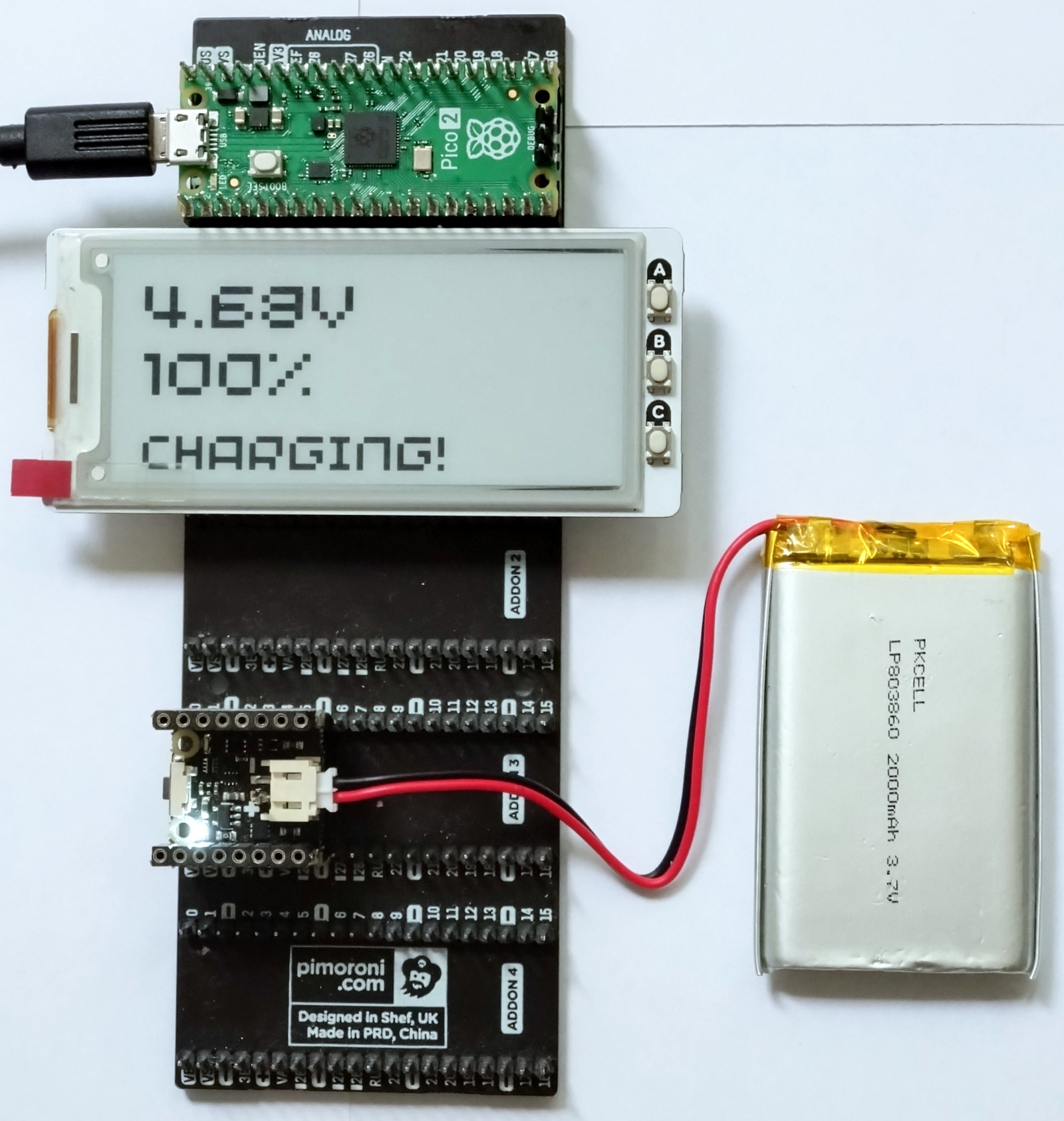 Płytka Li-Po SHIM for Pico firmy Pimoroni [3] jest małą i tanią nakładką na płytkę Pico/Pico 2. Umożliwia ona podłączenie akumulatora Li-Po/Li-Ion do zestawu z możliwością jego ładowania z gniazdka USB płytki Pico.