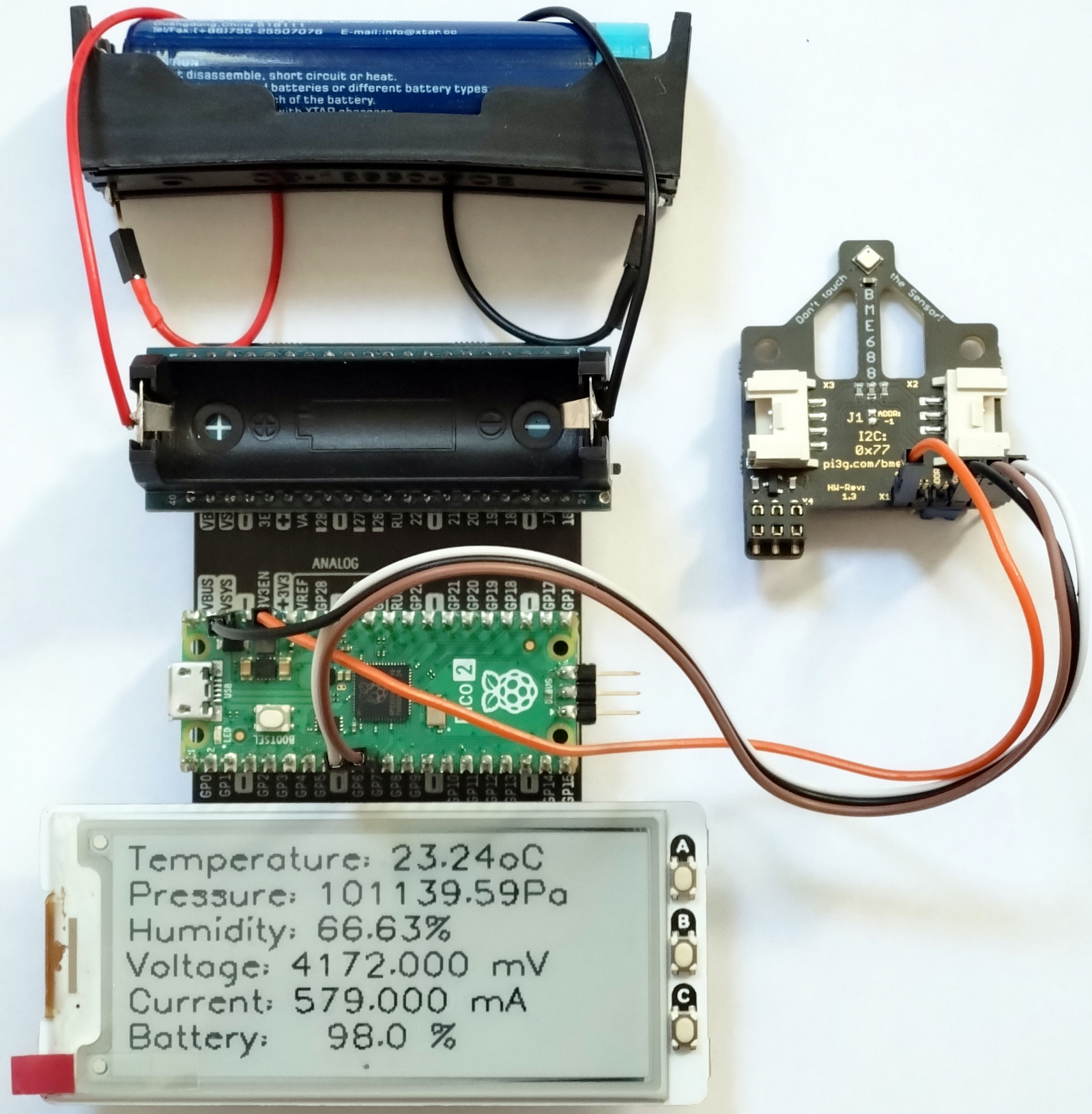 Zbudowany układ pomiarowy składa się z płytki Pico 2, Pico-UPS-A, ekspandera Pico Omnibus, wyświetlacza Pico INKY, płytki z czujnikiem BME688 oraz akumulatora XTAR 18650 2600 mAh (fotografia 2). Do obsługi układu INA219 został opracowany program pomiarowy w języku Python, opisany poniżej.
