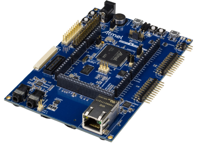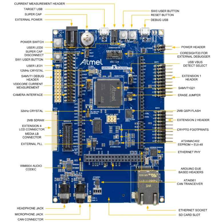 Zestaw uruchomieniowy SAM V71 Xplained Ultra Evaluation Kit zawiera mikrokontroler typu ATSAMV71Q21 wyposażony w 2 MB pamięci Flash, 384 kB pamięci RAM, sprzętowe bloki obliczeniowe FPU i DSP, kontroler zewnętrznych pamięci równoległych SRAM, NOR i NAND Flash oraz 24-bitowy interfejs wyświetlacza LCD. Ponadto jest przystosowany do pracy w zakresie temperatur -40°…+105° - spełnia kwalifikację AEC-Q100 wymaganą dla aplikacji branży automotive.