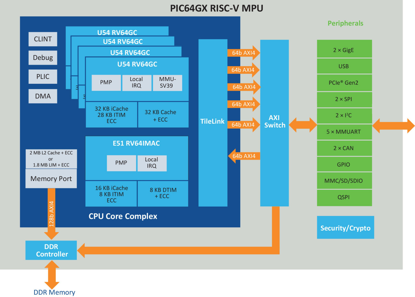 Zintegrowany 36-bitowy kontroler pamięci DDR4/LPDDR4 z korekcją błędów obsługuje pamięci DDR4 o przepustowości 1,6 Gb/s i oferuje przestrzeń adresową 8 GB. Kontroler zawiera jednostkę ochrony pamięci (MPU) oraz wbudowaną pamięć nieulotną 128 kB (eNVM) do obsługi procesu bootowania. Takie rozwiązanie zapewnia w pełni elastyczną konfigurację startową, umożliwiając podział hartów przy uruchomieniu – na te pracujące w trybie czasu rzeczywistego oraz te uruchamiające Linuksa – z odpowiednim wsparciem cache L2.
