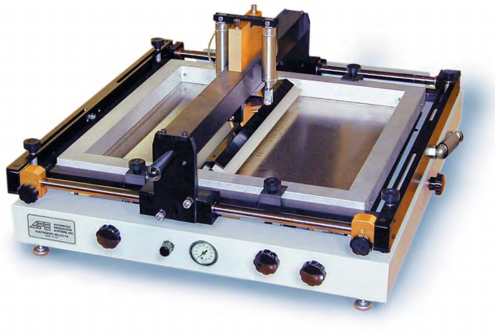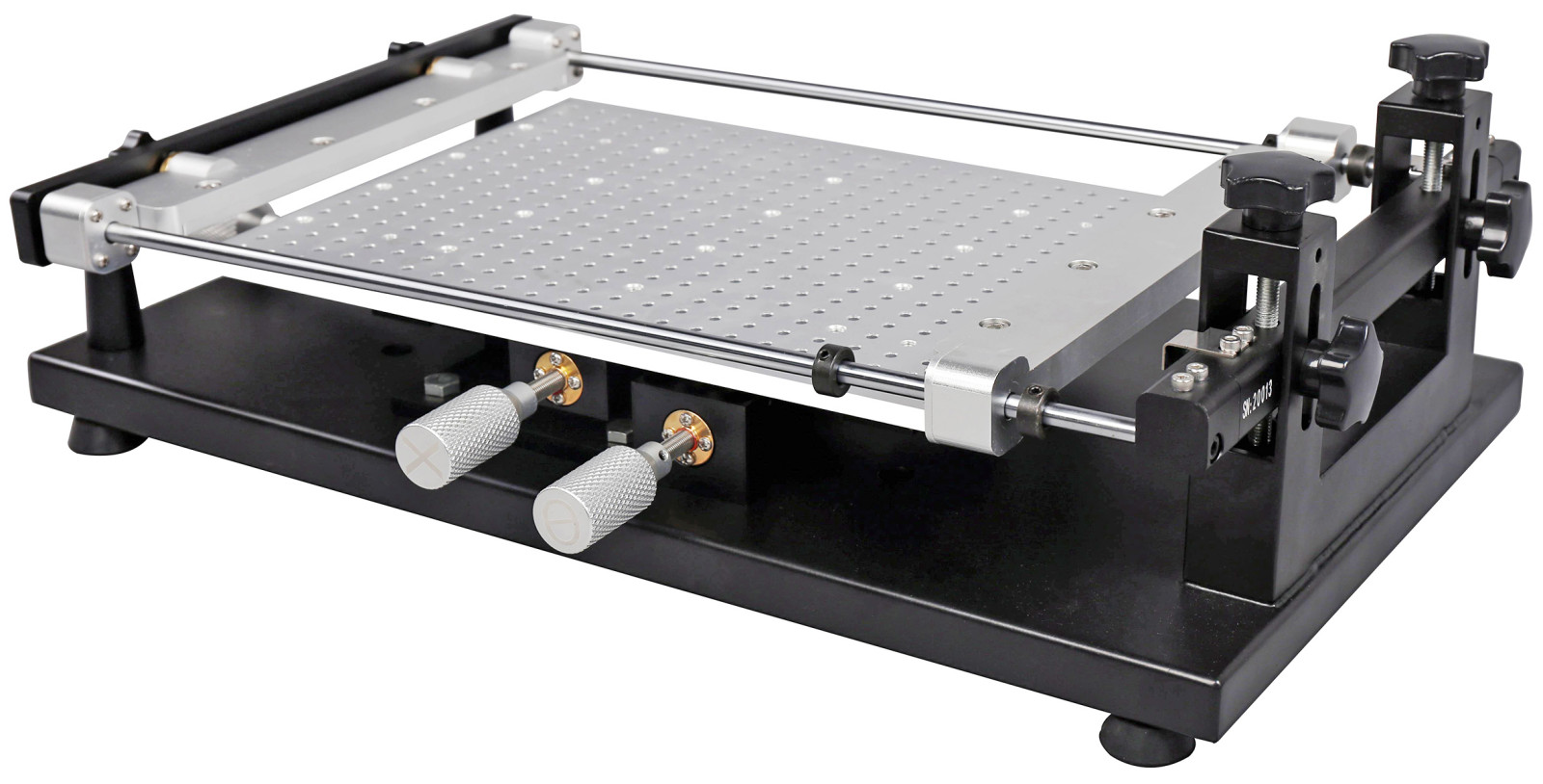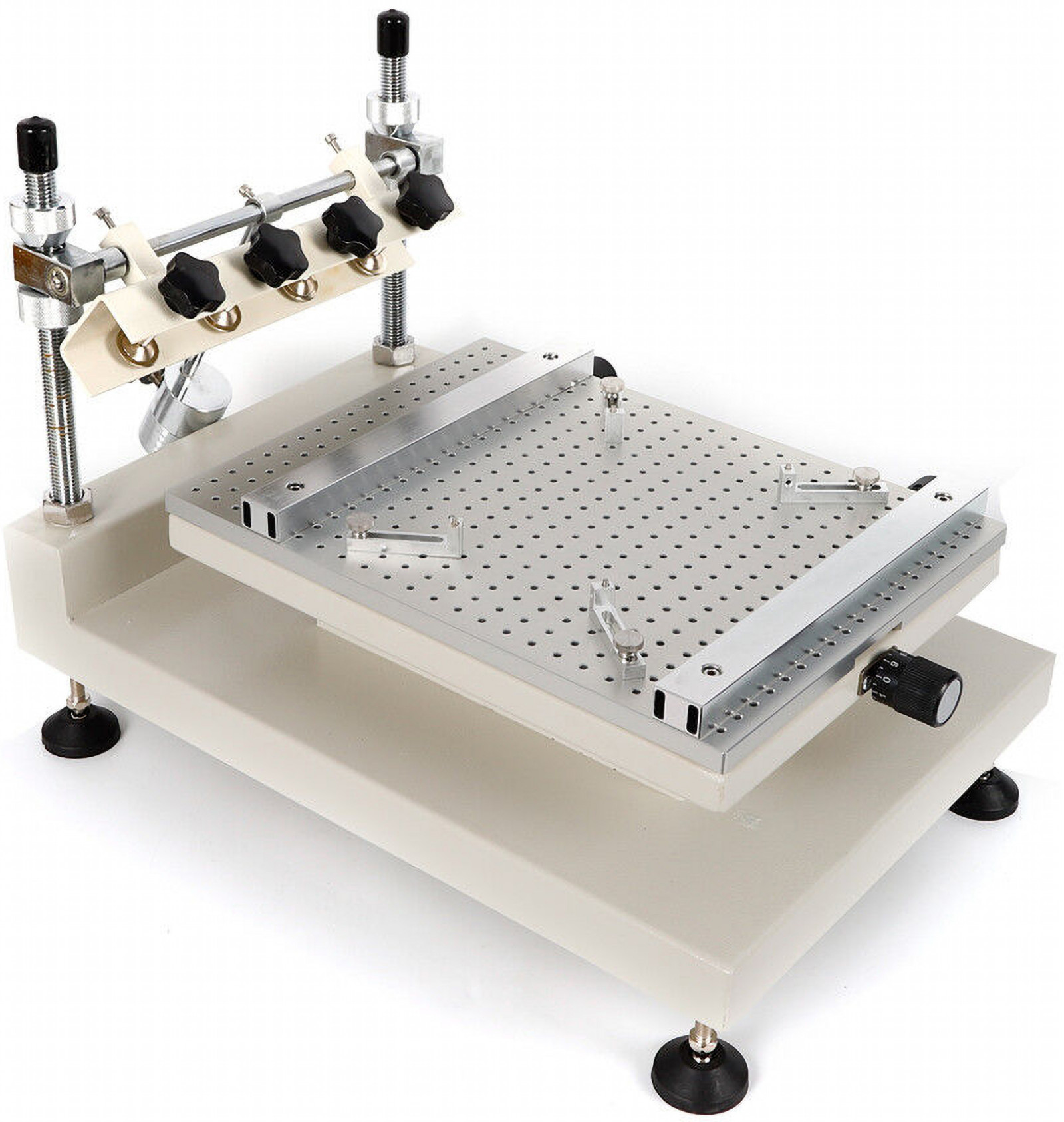 W przypadku produkcji małoseryjnej lub prototypowej pasta może być także nanoszona za pomocą drukarek manualnych – jest to rozwiązanie nieporównanie tańsze i bardziej kompaktowe w porównaniu do najprostszych nawet drukarek automatycznych oraz półautomatycznych. Na rynku istnieją zasadniczo dwa rodzaje tego typu prostych urządzeń, dostosowane do obsługi szablonów bez ramy lub fabrycznie naciągniętych na ramę aluminiową. Te pierwsze mają prosty, mechaniczny system mocowania i napinania szablonu, oparty na śrubach i odpowiednio sztywnych prowadnicach (fotografia 5).
