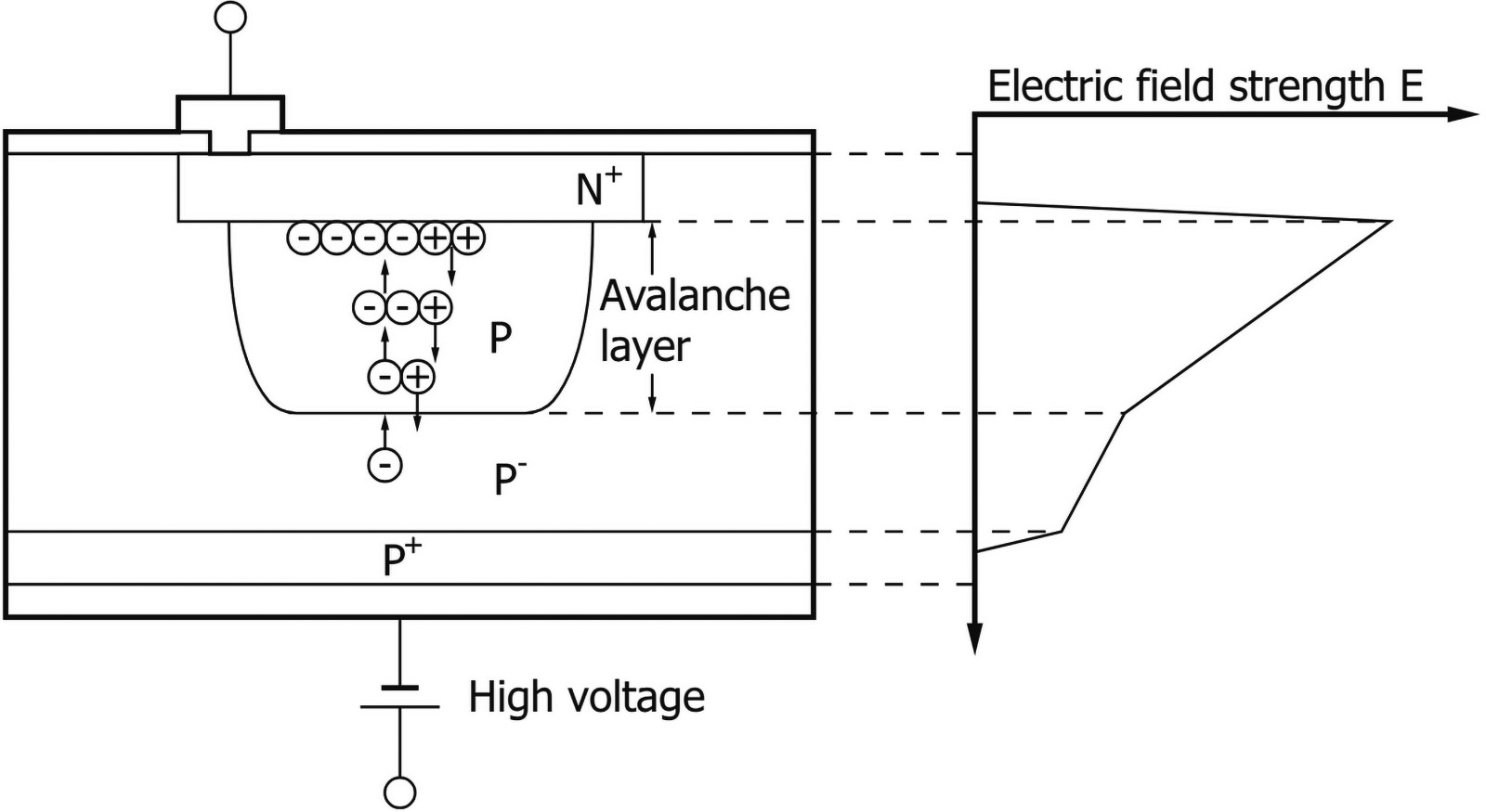 Sposób działania oraz układy pracy klasycznych fotodiod krzemowych (a także szybszych diod typu PIN) są z grubsza znane chyba każdemu konstruktorowi. Fotodiodę lawinową (ang. Avalanche PhotoDiode, APD) można rozpatrywać jako fotodiodę pracującą przy wysokiej polaryzacji zaporowej, która oprócz „klasycznego” generowania par elektron–dziura potrafi w dodatku owe nośniki zwielokrotnić (rysunek 1).