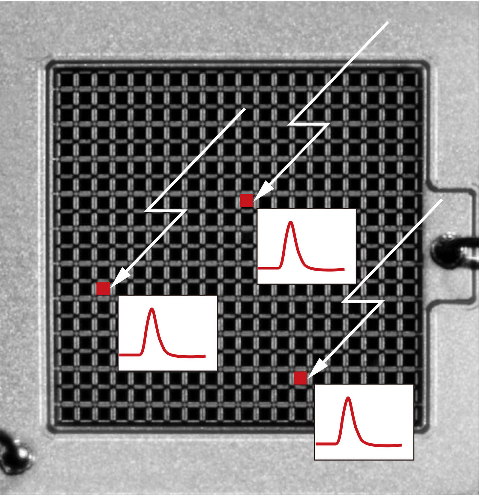 Macierz mikropikseli pracująca w trybie Geigera, określana skrótowo jako SiPM, czyli – dosłownie – krzemowy fotopowielacz (ang. Silicon PhotoMultiplier, w materiałach firmy Hamamatsu często nazywany także MPPC – Multi-Pixel Photon Counter) realizuje wzmocnienie inaczej. Zamiast jednego większego złącza lawinowego mamy tu gęstą macierz mikropikseli (rysunek 4), z których każdy pracuje w trybie Geigera – tj. o kilka woltów powyżej napięcia przebicia.