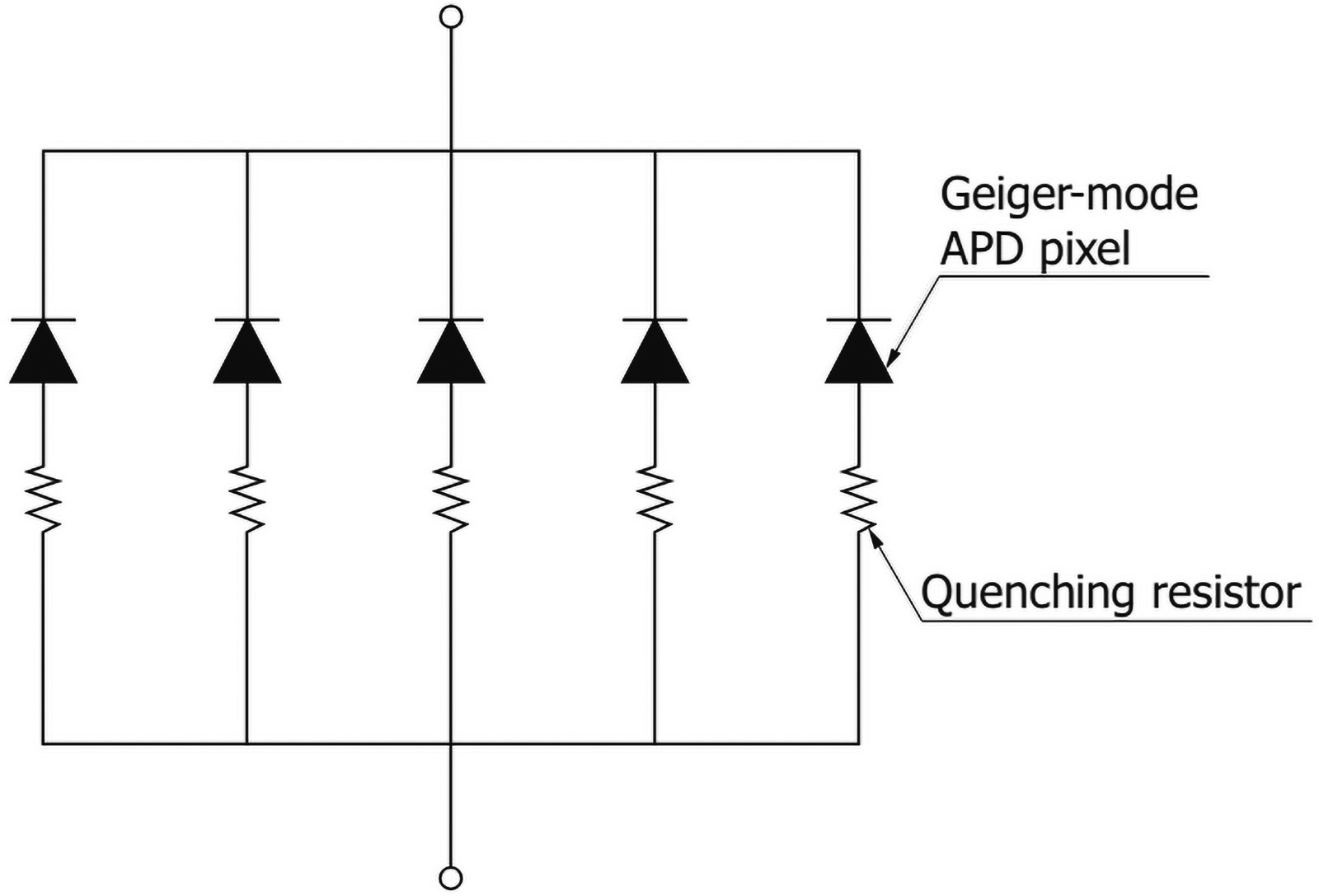 Tryb Geigera wymaga jednak mechanizmu wygaszania impulsów, aby piksel mógł zareagować na kolejny foton – w przeciwnym wypadku nastąpiłoby niejako „zatrzaśnięcie” (ang. fired) piksela, gdyż prąd zaporowy podtrzymywałby się samoistnie aż do momentu, w którym napięcie polaryzacji złącza spadłoby poniżej wartości umożliwiającej kontynuację lawiny. Najczęściej realizuje się to w banalnie prosty sposób – poprzez wzbogacenie każdego piksela o specjalny, miniaturowy rezystor gaszący (ang. quenching resistor), połączony w szeregu ze strukturą APD (rysunek 6).