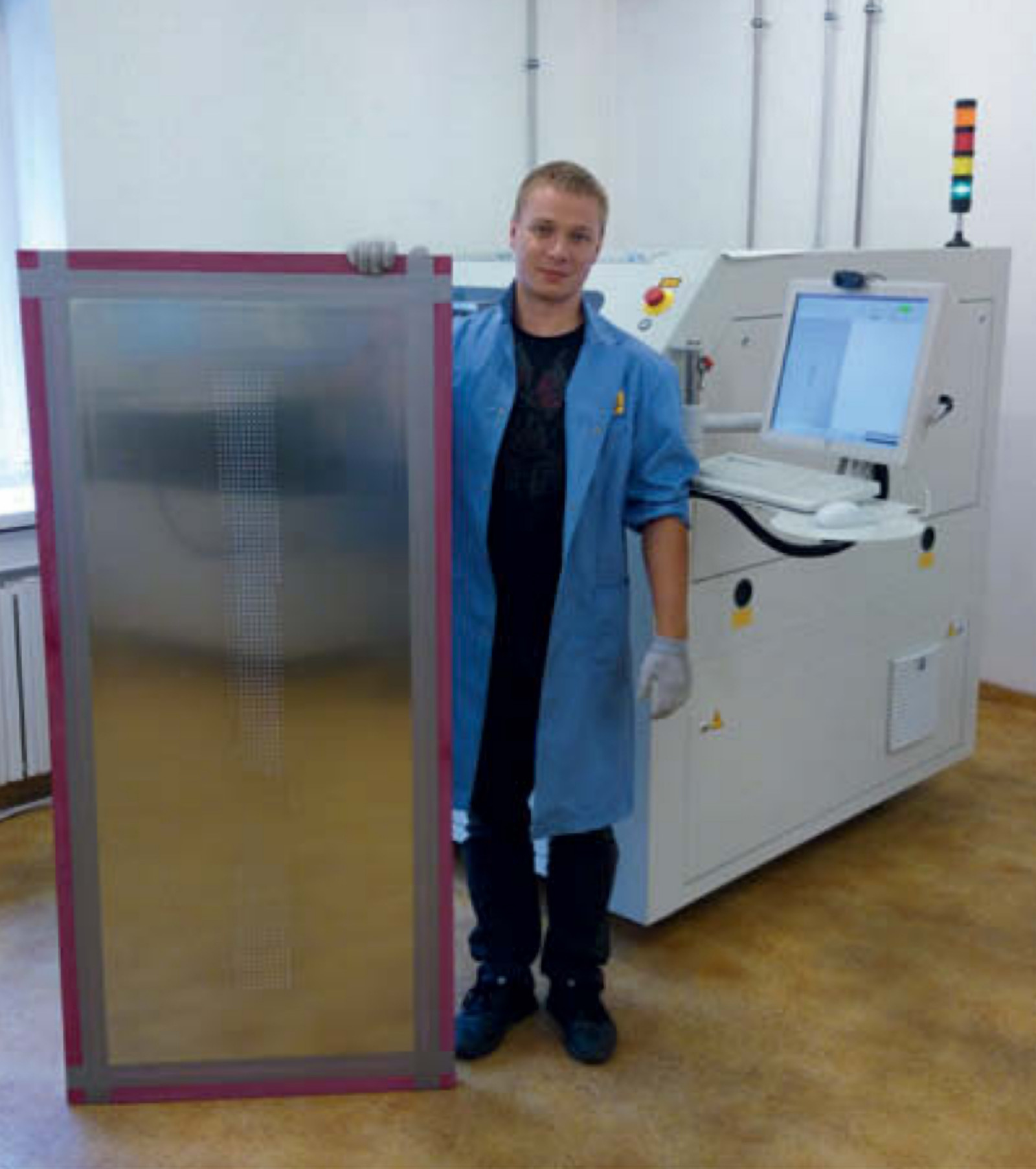 Równomierny i stabilny naciąg folii szablonu realizowany jest za pomocą siatki poliestrowej naciągniętej uprzednio na ramę wykonaną z profili aluminiowych. Typowe napięcie siatki wynosi 35±4 N/cm, a najpopularniejsze wymiary ram to 23×23”, 550×650 mm, 29×29”. Ostatnio, w związku z rozwojem technologii LED, stosuje się szablony na długich ramach, nawet do 180 cm (fotografia 4). Tak długie szablony możliwe są do realizacji wyłącznie w opisywanej technologii naciągu.