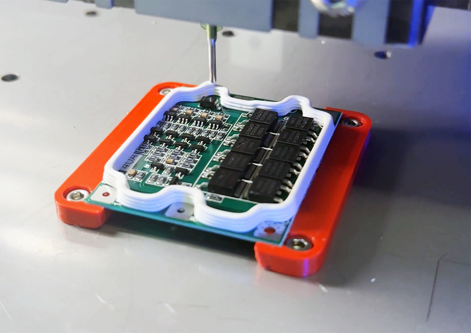 Jednym z rozwiązań odpowiadających na te potrzeby jest technologia znana jako DAM & FILL, co można swobodnie przetłumaczyć jako „bariera i wypełnienie”. W pierwszym etapie materiał o wysokiej lepkości, najczęściej jednoskładnikowy klej silikonowy o konsystencji pasty, jest dozowany jako „ściana” (dam) wzdłuż krawędzi lub wokół chronionego obszaru płytki PCB. Działa to jak mur oporowy lub tama zapobiegająca rozlewaniu się rzadszej zalewy, która zostanie użyta w drugim etapie. W kolejnym kroku przestrzeń wewnątrz tej bariery jest wypełniana materiałem o niskiej lepkości (fill) – może to być płynna zalewa silikonowa jedno lub dwuskładnikowa. Grubość warstwy zalewy wypełniającej zwykle wynosi około 5…10 mm, ale przy zastosowaniu zalew 2-składnikowych grubość może wynosić kilka centymetrów. Metoda DAM & FILL, chociaż wymaga dwóch oddzielnych etapów aplikacji, jest ceniona i często obecnie stosowana jako skuteczny sposób na hermetyzację elektroniki.