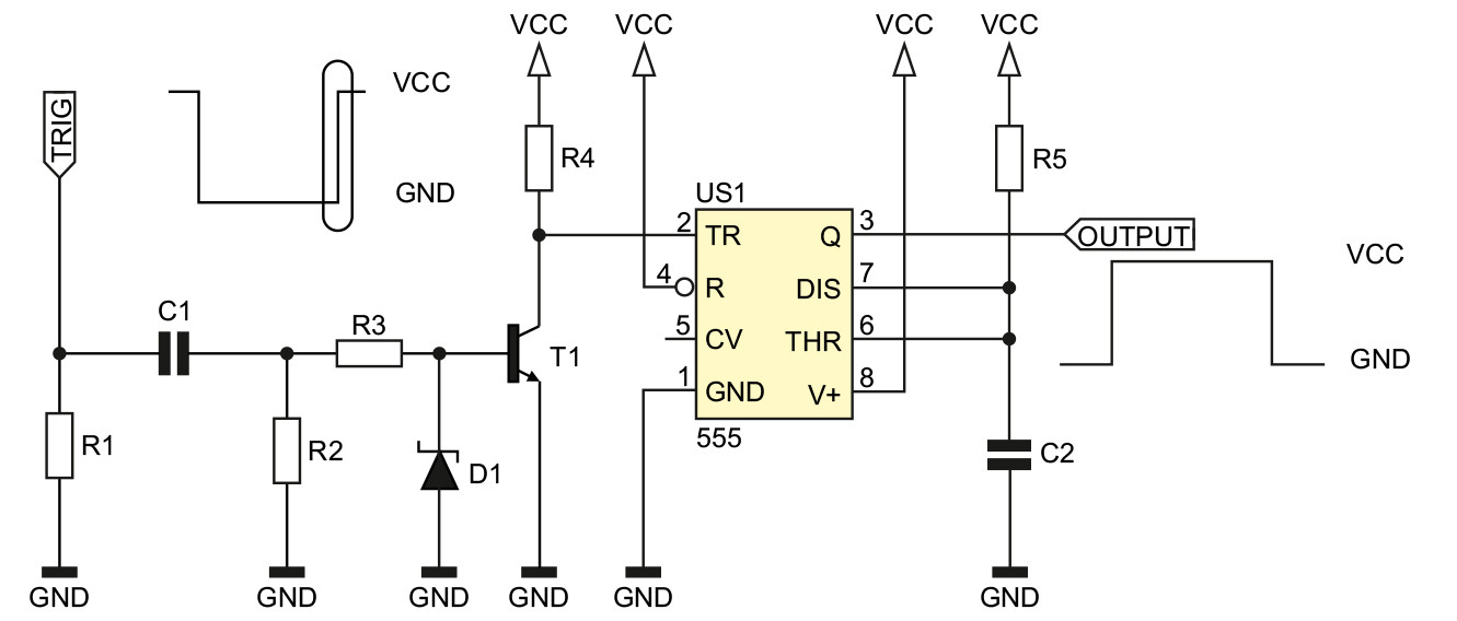 Jeżeli interesuje nas wyzwalanie zboczem narastającym, a nie opadającym, wówczas może być przydatny układ z rysunku 3. Tranzystor T1 służy do odwracania polaryzacji impulsu wyzwalającego: z dodatniego, który wchodzi na wejście układu, generuje ujemny, ponieważ obniża na chwilę potencjał wejścia TRIG. Dioda D1 zabezpiecza przed przebiciem wstecznym złącza baza-emiter tranzystora T1. Wejściowy układ różniczkujący, tak jak poprzednio, formuje impuls wyzwalający o ustalonej długości.