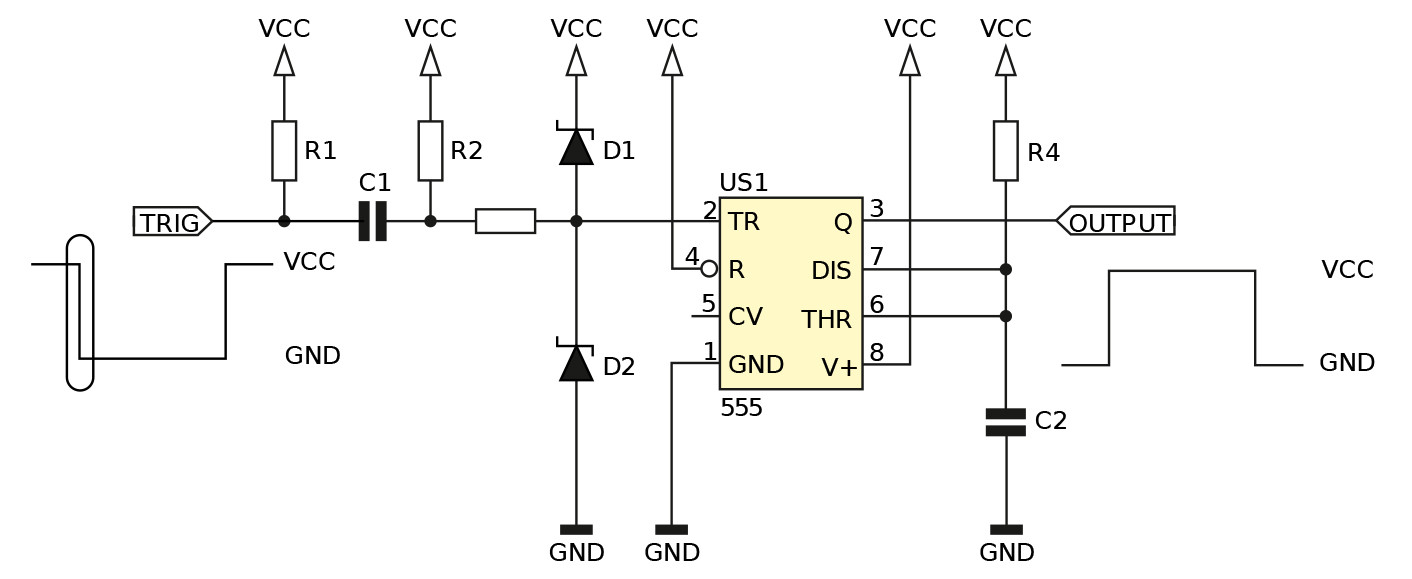 Skupię się natomiast na pewnym mankamencie tego układu: impuls wyzwalający musi być krótszy od tego, który jest wytwarzany przez układ, a którego długość ustala się poprzez dobranie stałej czasowej obwodu R2C1. Nie zawsze jest możliwe zagwarantowanie spełnienia tego wymogu w rzeczywistych warunkach – na przykład, jeżeli przełącznik chwilowy na klatce schodowej (uruchamiający oświetlenie na kilka minut) zostanie przez kogoś zablokowany w pozycji zwartej. Wtedy warto zróżniczkować impuls wejściowy i wydobyć z niego jedynie zbocze opadające, choćby takim obwodem jak na rysunku 2. Rezystory R1 i R2 utrzymują kondensator C1 w stanie rozładowania, z kolei stała czasowa R2C1 decyduje o długości impulsu wyzwalającego, którego długość może wynosić choćby zaledwie kilka milisekund. Ponieważ jednak przy przeładowywaniu C1 na wejściu TRIG układu 555 mogą pojawić się impulsy szpilkowe o wartości chwilowej wyższej niż napięcie zasilające lub niższej niż 0 V, zostały dodane diody D1 i D2 „obcinające” te impulsy. Z kolei rezystor R3 ogranicza prąd tych diod.