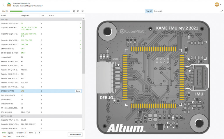 Interfejs aplikacji jest intuicyjny i łatwy w użyciu. Na ekranie wyświetlany jest wykaz materiałów zawierający wszystkie komponenty potrzebne do montażu płytki. Umożliwia on przechodzenie od komponentu do PCB w widoku 2D/3D, aby szybko zobaczyć dokładną fizyczną lokalizację komponentu na płytce. Możesz oznaczać każdy zamontowany komponent, pomijać części (jeśli to konieczne) oraz przeglądać lokalizację (w tym górną i dolną stronę płytki) wszystkich elementów. Ponieważ wszystko odbywa się w połączonej przestrzeni roboczej, każda zmiana projektu jest automatycznie odzwierciedlana w BOM-ie, bez konieczności ręcznej aktualizacji dokumentacji.