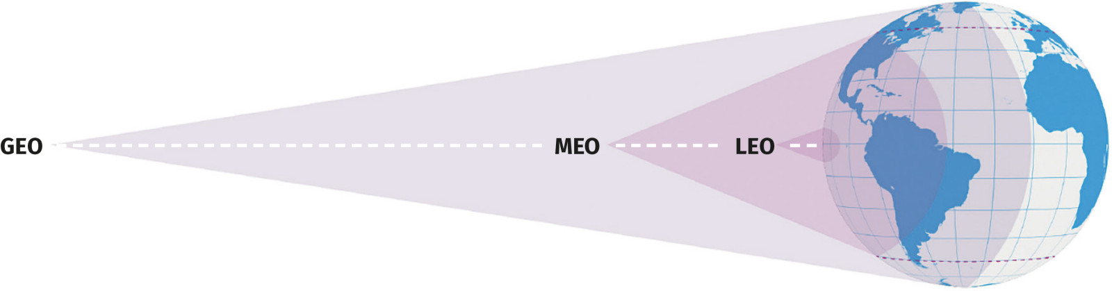 Na rysunku 1 przedstawione jest porównanie obszaru pokrycia na powierzchni Ziemi dla trzech popularnych wysokości orbitalnych: orbity geosynchronicznej (GEO), średniej orbity okołoziemskiej (MEO) i niskiej orbity okołoziemskiej (LEO).