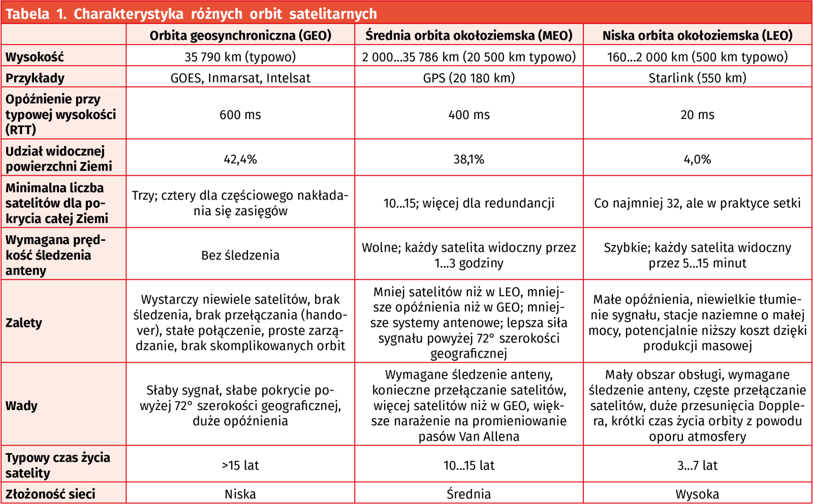 Satelity Starlink są umieszczane na orbicie LEO. Na rysunku 2 i w tabeli 1 przedstawione są dane dotyczące orbit GEO, MEO i LEO.