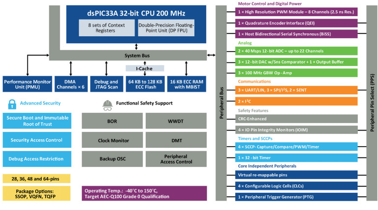 Pierwsza wprowadzona na rynek rodzina dsPIC33AK128MC1xx będzie zawierać 128 kB pamięci Flash i rozbudowany zestaw peryferiów. Układy udostępnione zostaną w obudowach SSOP, VQFN i TQFP (od 28 do 64 pinów), przy wymiarach obudowy zredukowanych nawet do 4×4 mm. Kolejne podgrupy układów dsPIC33A z dodatkową pamięcią, peryferiami i większą liczbą pinów uzupełnią portfolio firmy Microchip w zakresie zintegrowanych kontrolerów napędów elektrycznych.