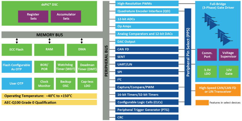 Sterowniki zintegrowane z omawianej rodziny działają na pojedynczym zasilaniu do 29 V (praca ciągła)/40 V (stany przejściowe) i zapewniają wysoką wydajność obliczeniową dzięki taktowaniu do 70...100 MHz. Ułatwiają wydajną implementację FOC i innych zaawansowanych algorytmów sterowania silnikiem. Wbudowany stabilizator LDO 3,3 V zasila rdzeń dsPIC, eliminując potrzebę stosowania zewnętrznego regulatora liniowego bądź DC/DC.