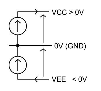 Mając na myśli zasilanie symetryczne, mamy na ogół przed oczami układ jak na rysunku 1. Jedno źródło napięciowe jest włączone między masę a dodatnią linię zasilającą, wymuszając jej potencjał. Źródło to „wypycha” z siebie prąd w kierunku tejże linii. Z kolei drugie źródło znajduje się między masą a ujemną linią zasilającą, przy czym jego rolą jest „wciąganie” prądu z tego węzła do masy. Jeżeli oba te prądy (dodatniej i ujemnej gałęzi) są sobie równe, to przez masę nie powinien płynąć dodatkowy prąd wyrównawczy – tak mówi teoria.