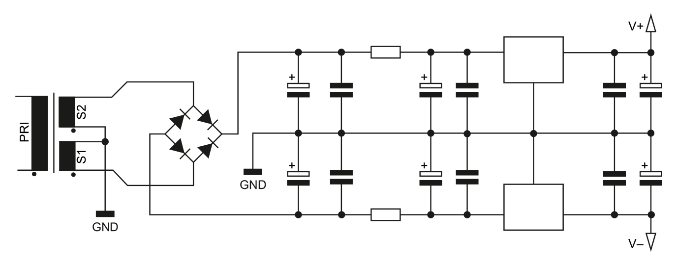 Ten naddatek warto wykorzystać na poprawę filtracji napięcia zasilającego. Można to uzyskać na wiele sposobów, ja z reguły ograniczam się do dwóch najbardziej typowych metod. Pierwszą z nich jest użycie filtru CRC przed stabilizatorem, co jest metodą znaną z układów lampowych – rysunek 2. W ten sposób redukujemy wartość międzyszczytową tętnień napięcia jeszcze przed stabilizatorem, który ma przecież skończone możliwości w zakresie tłumienia składowej zmiennej napięcia. Co istotne, takie posunięcie ogranicza nie tylko energię składowych niskoczęstotliwościowych (100 Hz oraz wyższych harmonicznych), lecz również wysokoczęstotliwościowych zakłóceń.