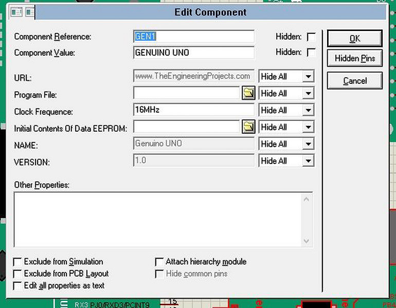 Na przykład klikając dwukrotnie na płytkę Arduino UNO, okno właściwości będzie wyglądało tak, jak na poniższym rysunku: