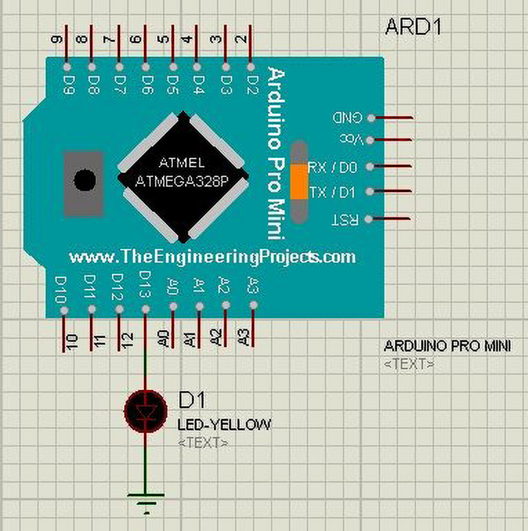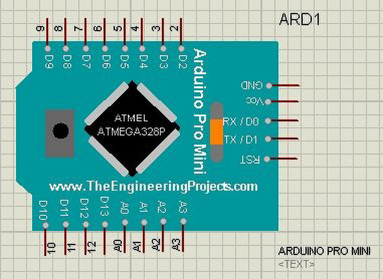Płytka Arduino Pro Mini w Proteusie będzie wyglądała jak na poniższym rysunku: