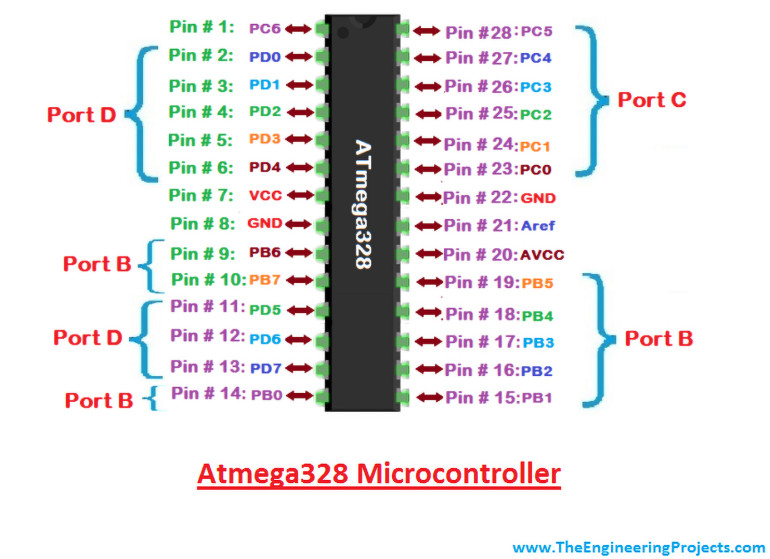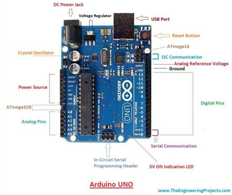 Atmega328 mikrokontroler jest umieszczony na płycie, która zawiera wiele funkcji, takich jak timery, liczniki, przerwania, PWM, CPU, piny I/O i oparty na 16 MHz zegar, który pomaga w produkcji większej częstotliwości i liczby instrukcji na cykl.