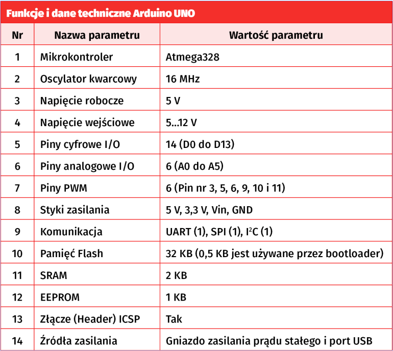 Arduino Uno oparte jest na mikrokontrolerze AVR o nazwie Atmega328. Kontroler wyposażony jest w 2 KB pamięci SRAM, 32 KB pamięci Flash, 1 KB pamięci EEPROM. Płytka Arduino posiada 14 pinów cyfrowych i 6 analogowych. Wbudowany przetwornik ADC jest używany do próbkowania tych pinów. Na płytce umieszczony jest oscylator kwarcowy o częstotliwości 16 MHz. Poniższy rysunek przedstawia rozmieszczenie pinów na płytce Arduino Uno.