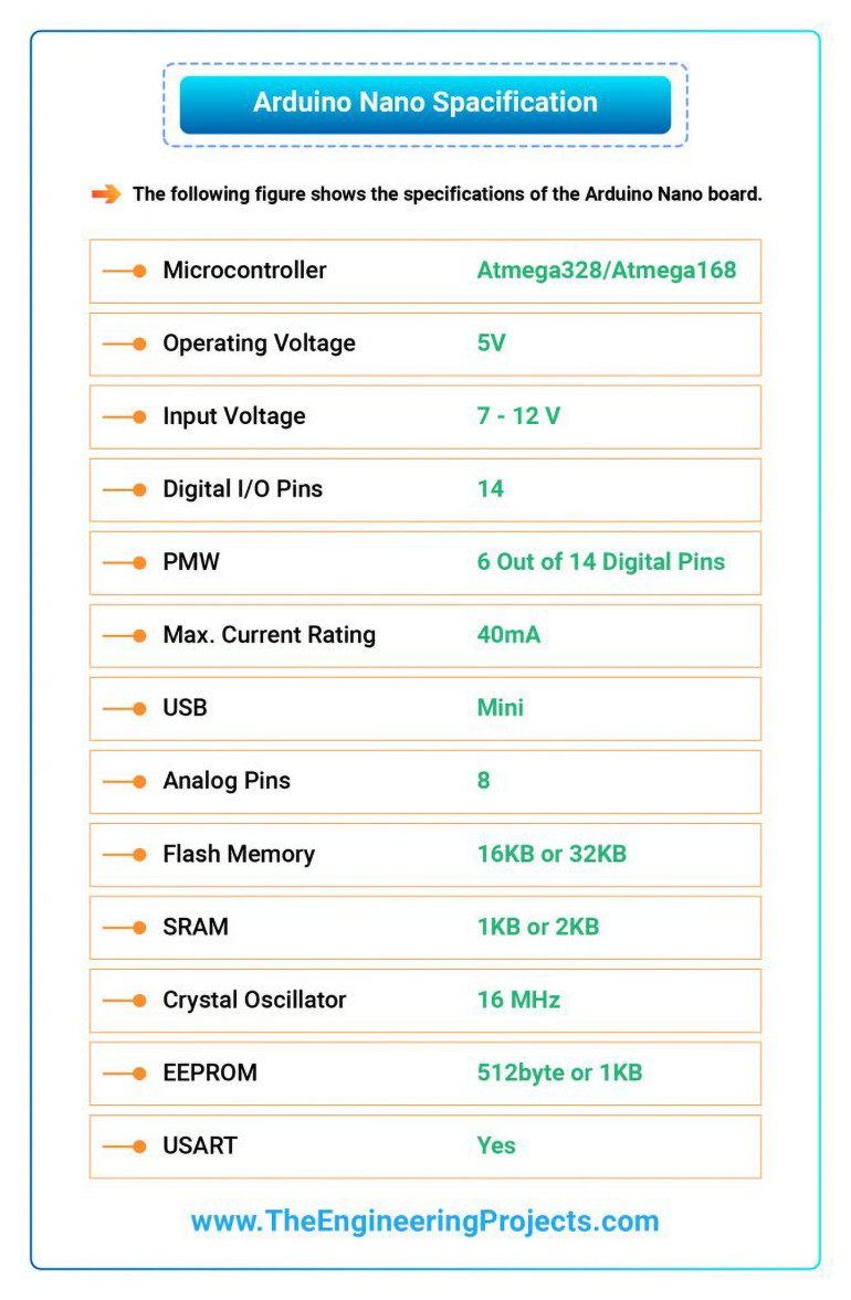 Jest jedno ograniczenie w używaniu Arduino Nano, mianowicie nie jest ono dostarczane z gniazdem zasilania prądu stałego, co oznacza, że nie można zasilać go z zewnętrznego źródła zasilania poprzez baterię.