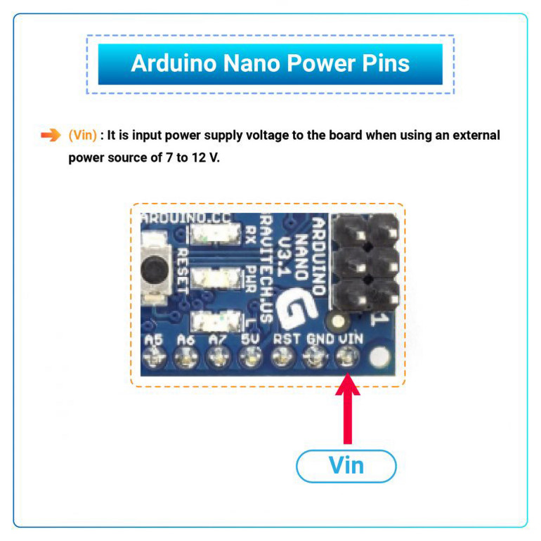 Vin: Jest to napięcie wejściowe zasilające płytkę przy korzystaniu z zewnętrznego źródła zasilania 7 do 12 V.