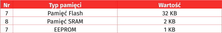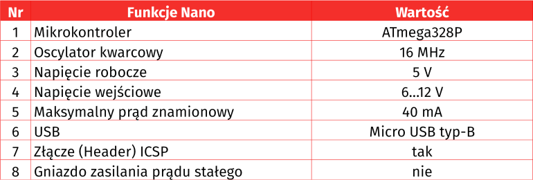 Poniżej znajduje się tabela przedstawiająca najważniejsze cechy Arduino Nano: