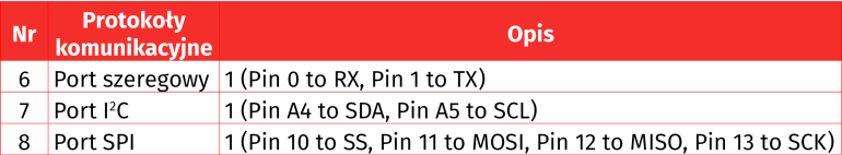 Protokół SPI: Cztery piny 10 (SS->Slave Select), 11 (MOSI -> Master Out Slave In), 12 (MISO -> Master In Slave Out) i 13 (SCK -> Serial Clock) są wykorzystywane do obsługi protokołu SPI (Serial Peripheral Interface).