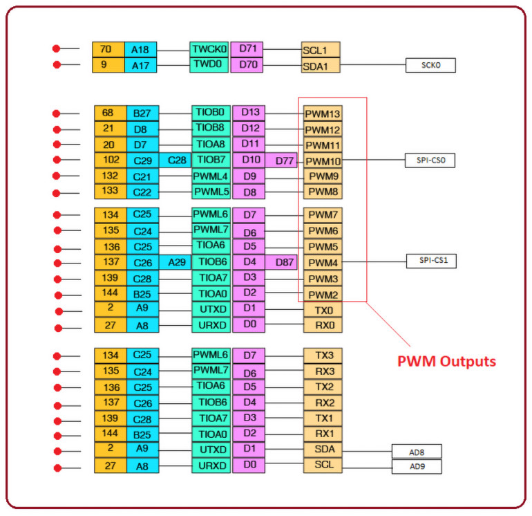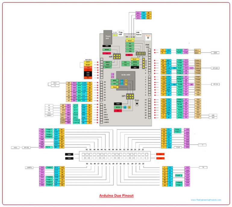 Arduino Due posiada cztery porty o nazwach PORTA, PORTB, PORTC i PORTD. W układzie znajdują się 54 piny I/O. Piny oznaczone kolorem RÓŻOWYM na powyższym schemacie pinów są używane jako cyfrowe piny I/O.