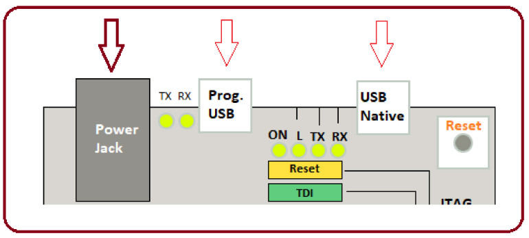 Na płytce dostępne są dwa porty USB, z których jeden to port USB do programowania, a drugi to natywny port USB. Oba porty mogą być wykorzystane do programowania, jednak port natywny pełni również funkcję hosta USB dla podłączonych urządzeń peryferyjnych, takich jak klawiatury czy smartfony.