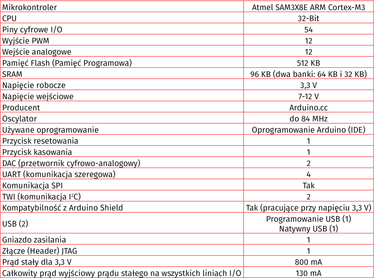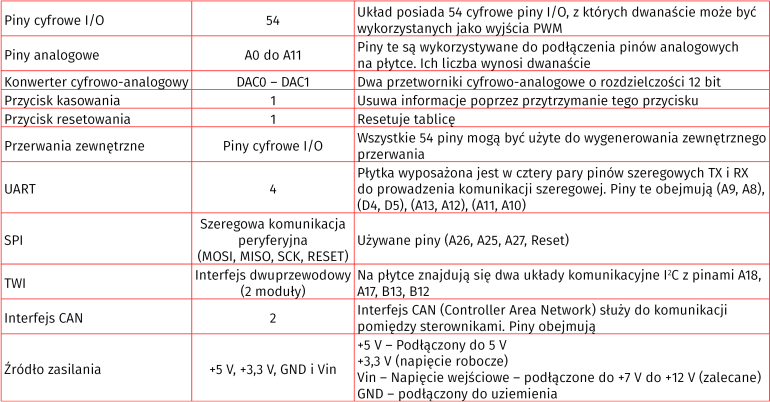 Poniższa tabela przedstawia główne funkcje Arduino Due.