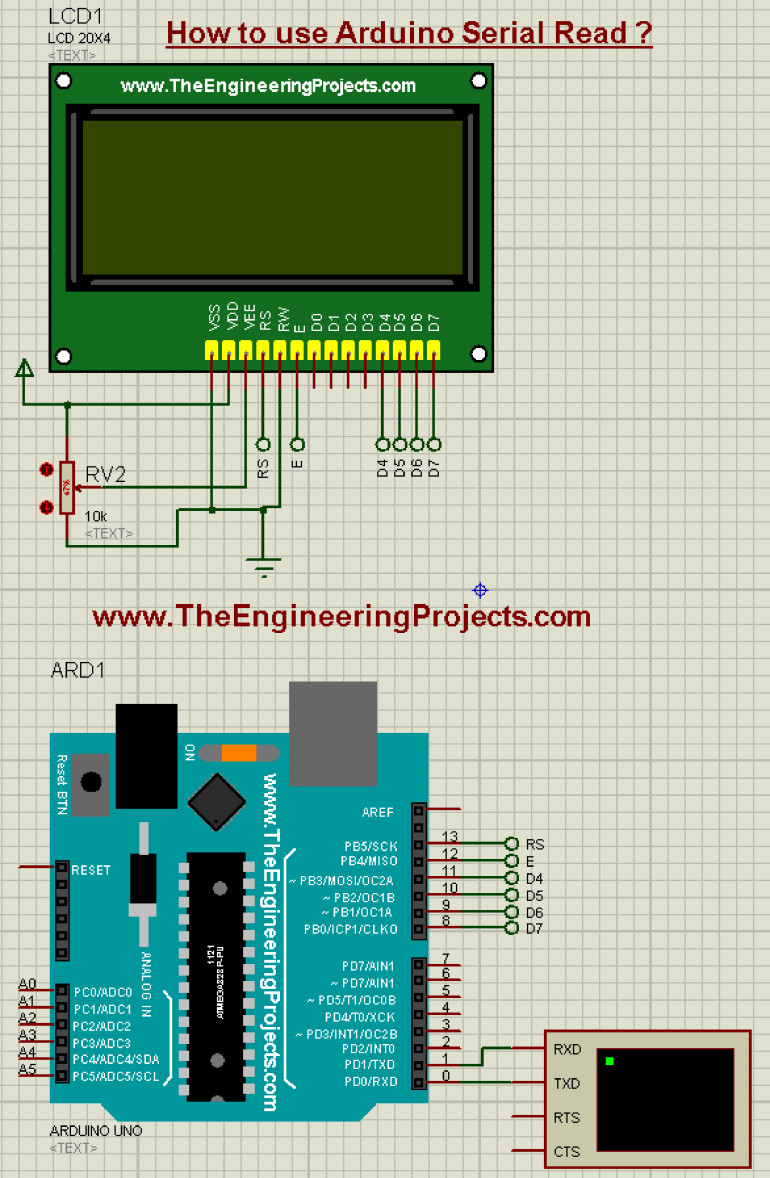 Na powyższym rysunku umieściłem wyświetlacz LCD i będę pobierał dane z portu szeregowego, a następnie będę drukował te dane na wyświetlaczu LCD.