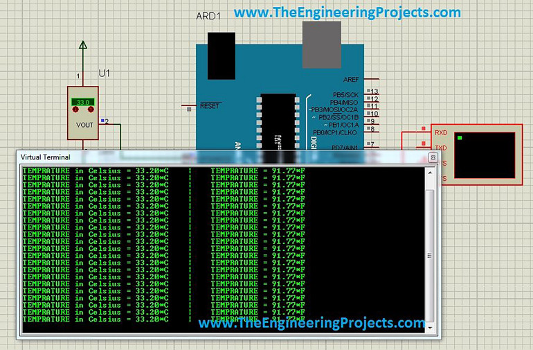 Widać, że wirtualny terminal pokazuje tę samą wartość, co na czujniku, która wynosi 33 w stopniach Celsjusza, a 92 przekonwertowana na stopnie Fahrenheita.