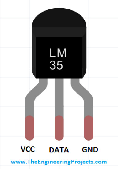 - Środkowy pin to jego pin danych, a LM35 daje wyjście, gdy mierzy temperaturę.