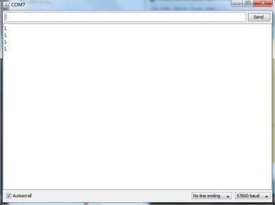 Teraz otwórz swój Monitor Szeregowy po stronie odbiornika i zobaczysz, że otrzymujesz "1" w polu Monitora Szeregowego Arduino, co jest wartością zmiennej Command, którą ustawiliśmy po stronie nadajnika, jak pokazano na poniższym zrzucie ekranu: